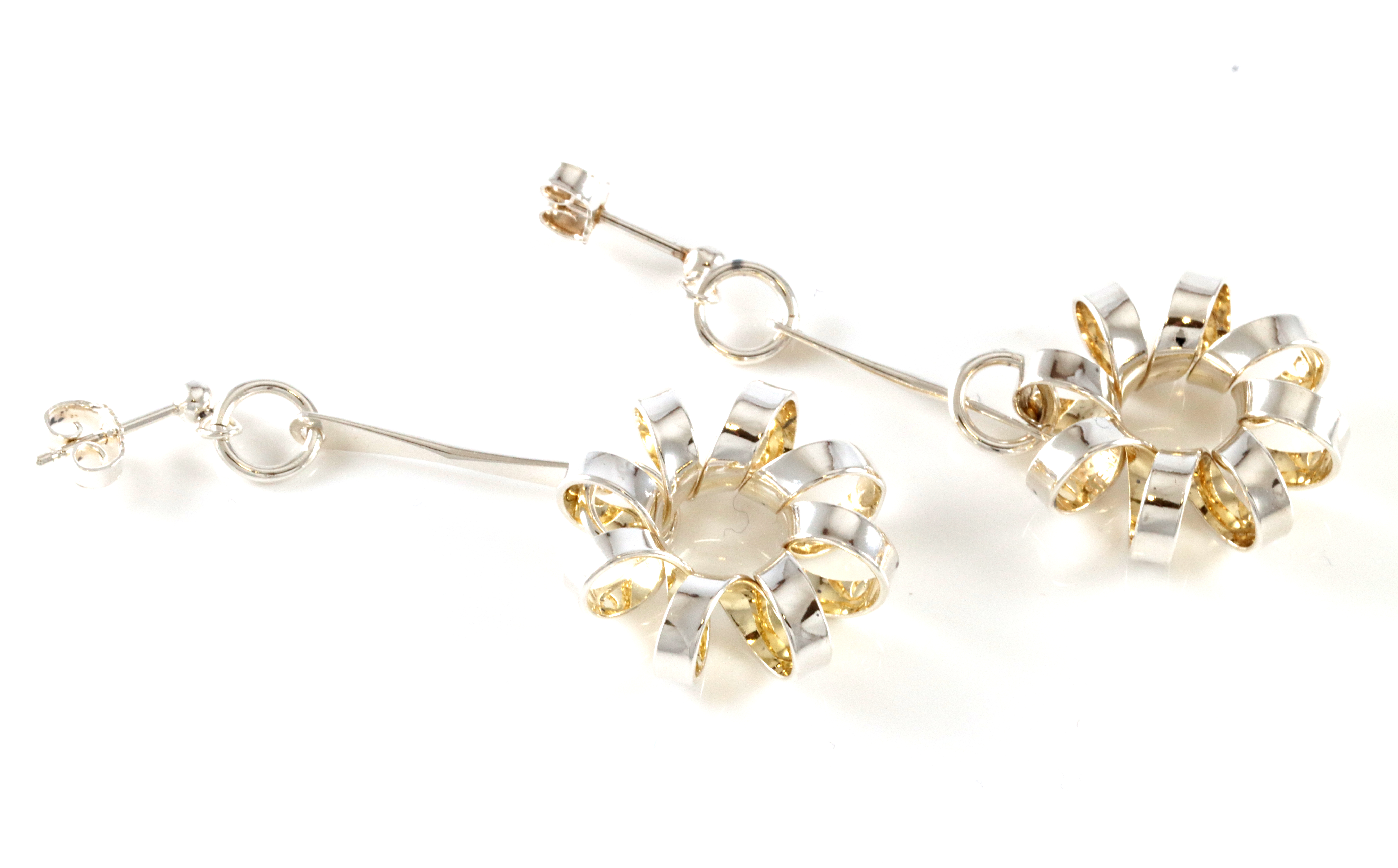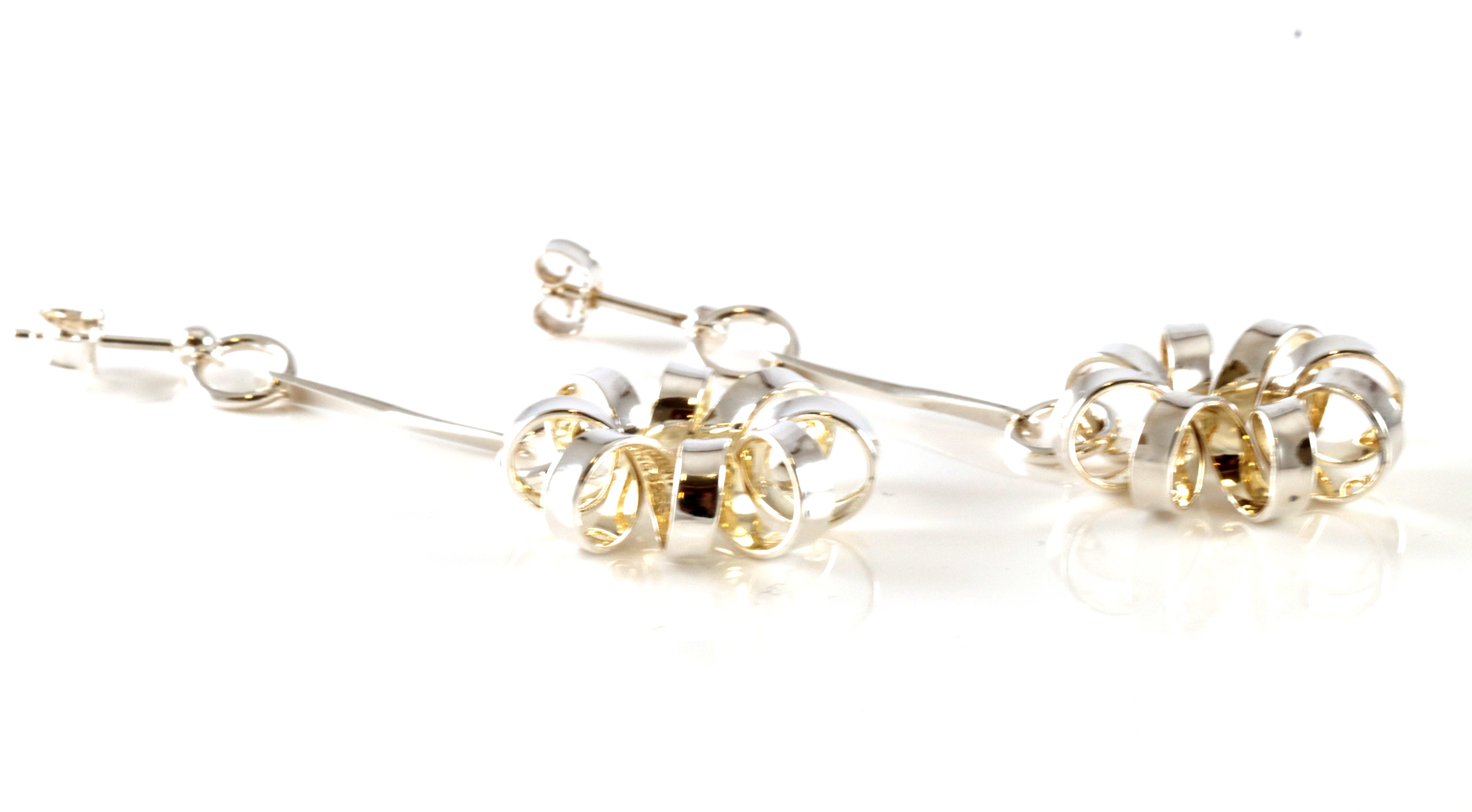 Ørepynt i sølv fra serien "Buzz" designet av Anna-Greta Eker for PLUS. Ørepynten finnes i to typer, dette er typen med lang stang. 6,0 cm lange.