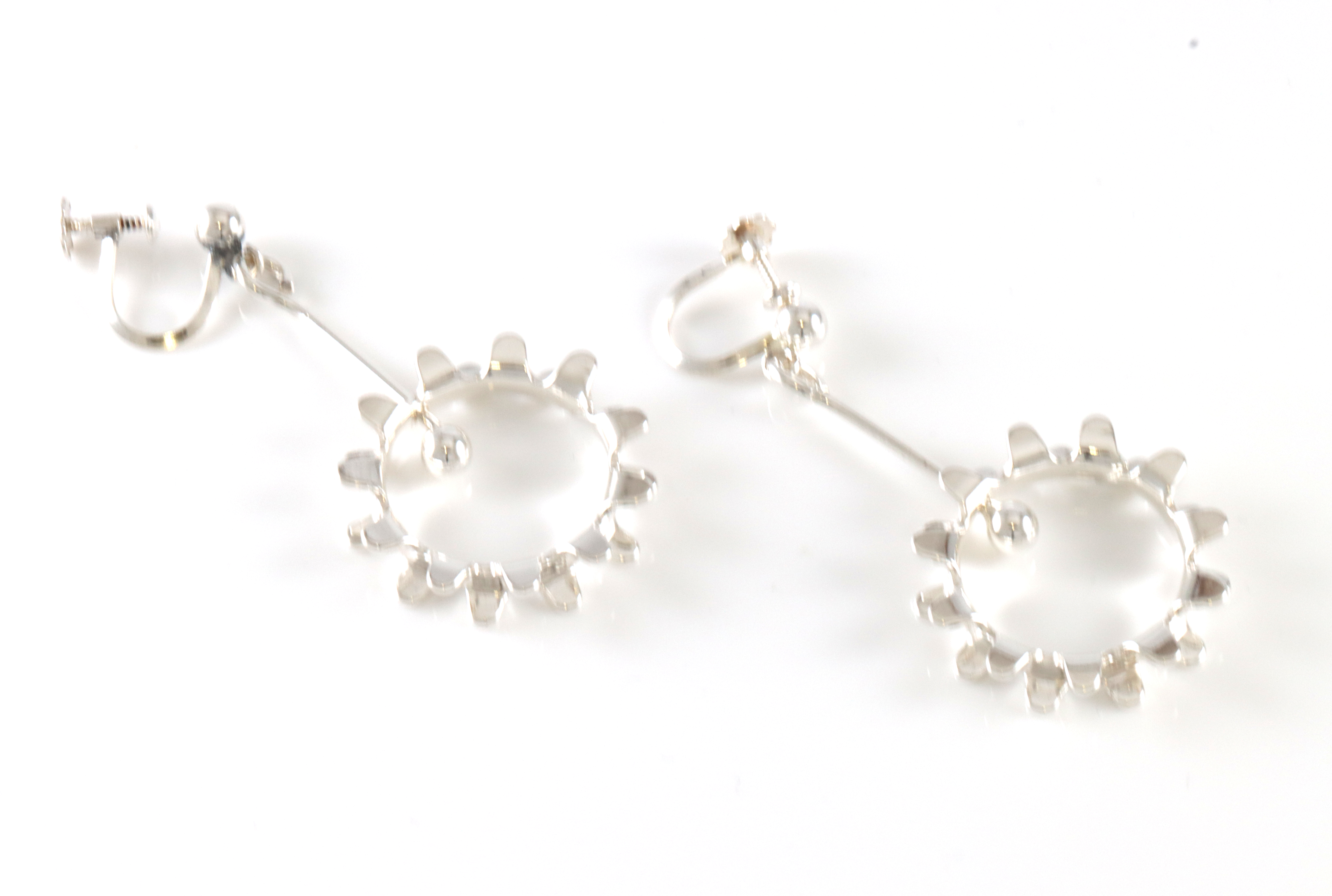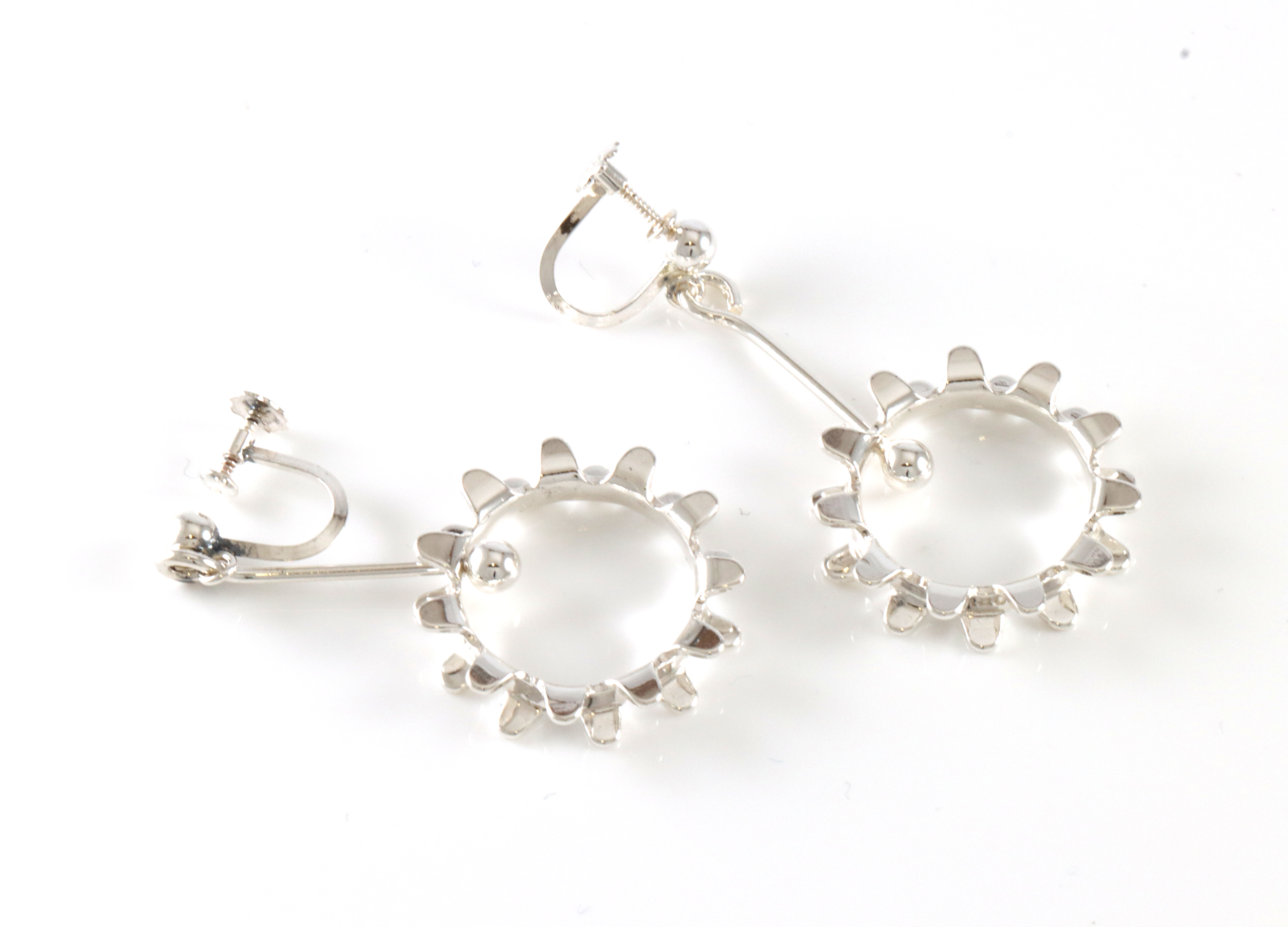 Ørepynt i sølv, designet av Tone Vigeland for PLUS. Navngitt "Sun". Det finnes to typer ørepynt av Sun, dette er varianten med lang stang. 4,6 cm lange