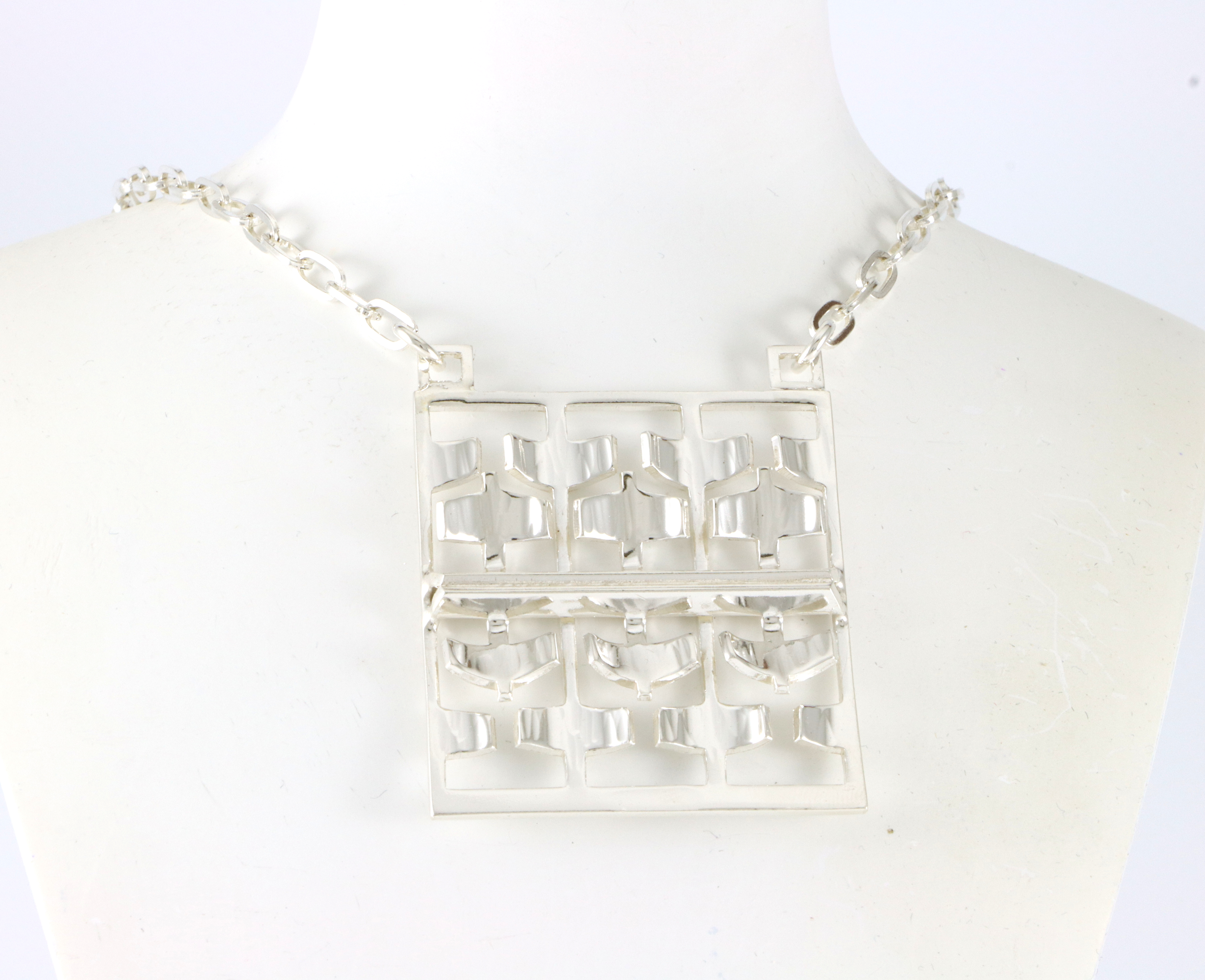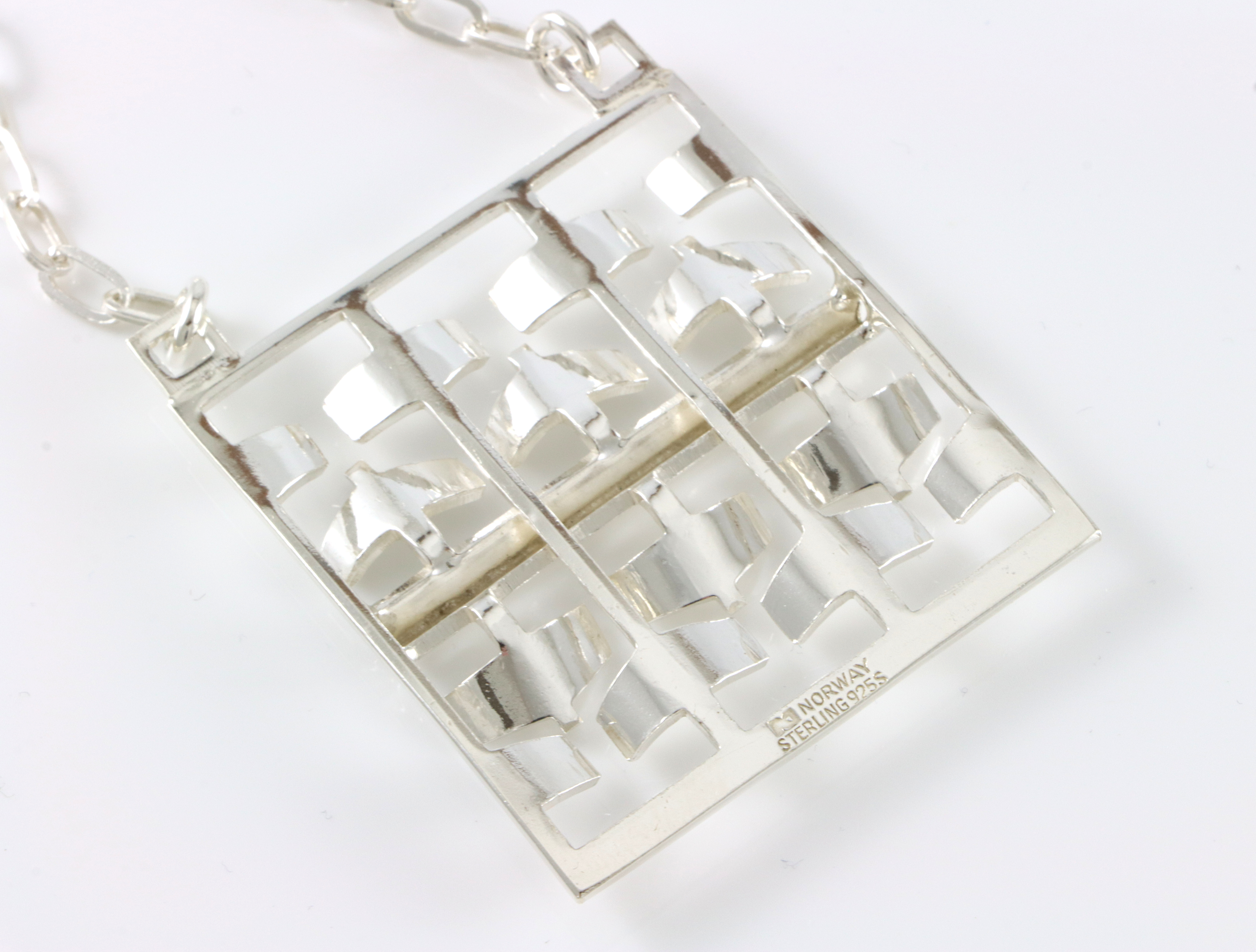 Kjede og anheng fra PLUS i Fredrikstad. Det er ofte omtalt som Tone Vigeland sitt design, men finner ingen skriftlig kilde på det. Anhenget måler 5,5 x 4,4 cm.