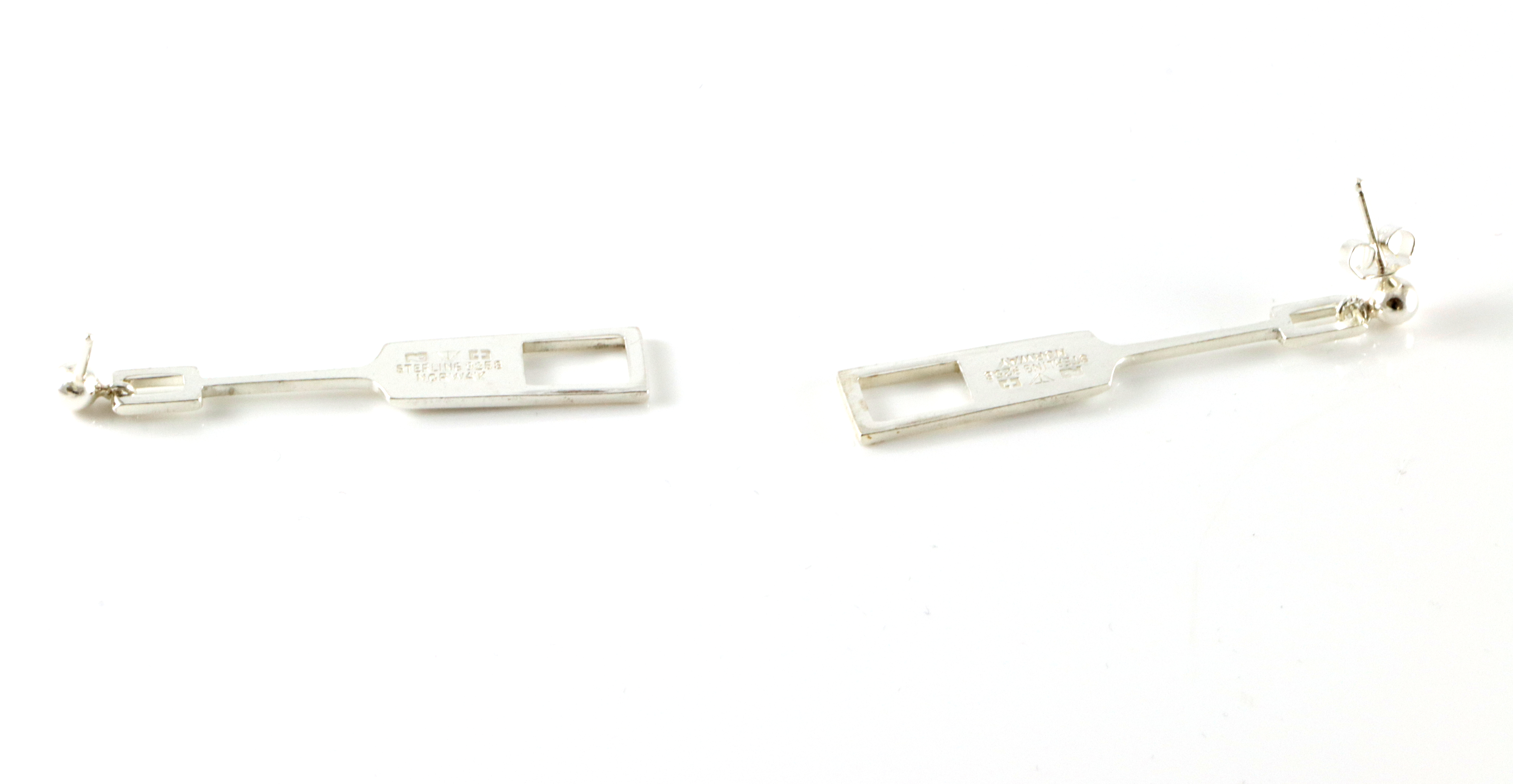 Ørepynt i sølv. Designet av Tone Vigeland for PLUS. Modellnummer H7, navn: Medium Med stikk. 4,8 cm lange. Arkivbilde