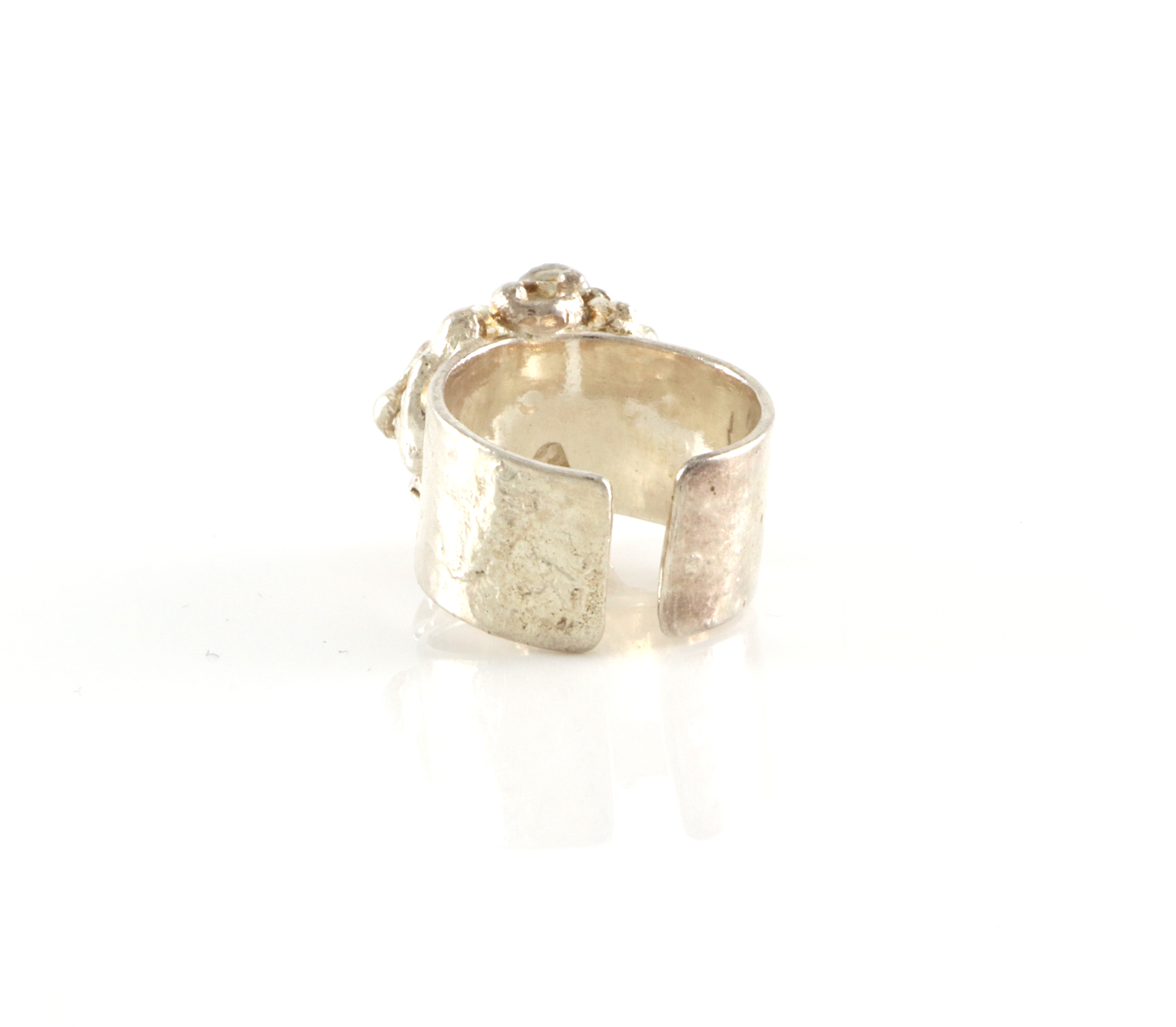 Fantastisk flott sølvring Ringen har en slags "smeltet" finish på skinnen. Liten rød stein på toppen Ringen er veldig bred så noe vanskelig å måle ringstørrelse men ca 53/54. Skinnen er åpen så det kan justeres. Dessverre kun sølvstempel, så produsent er ukjent for oss.