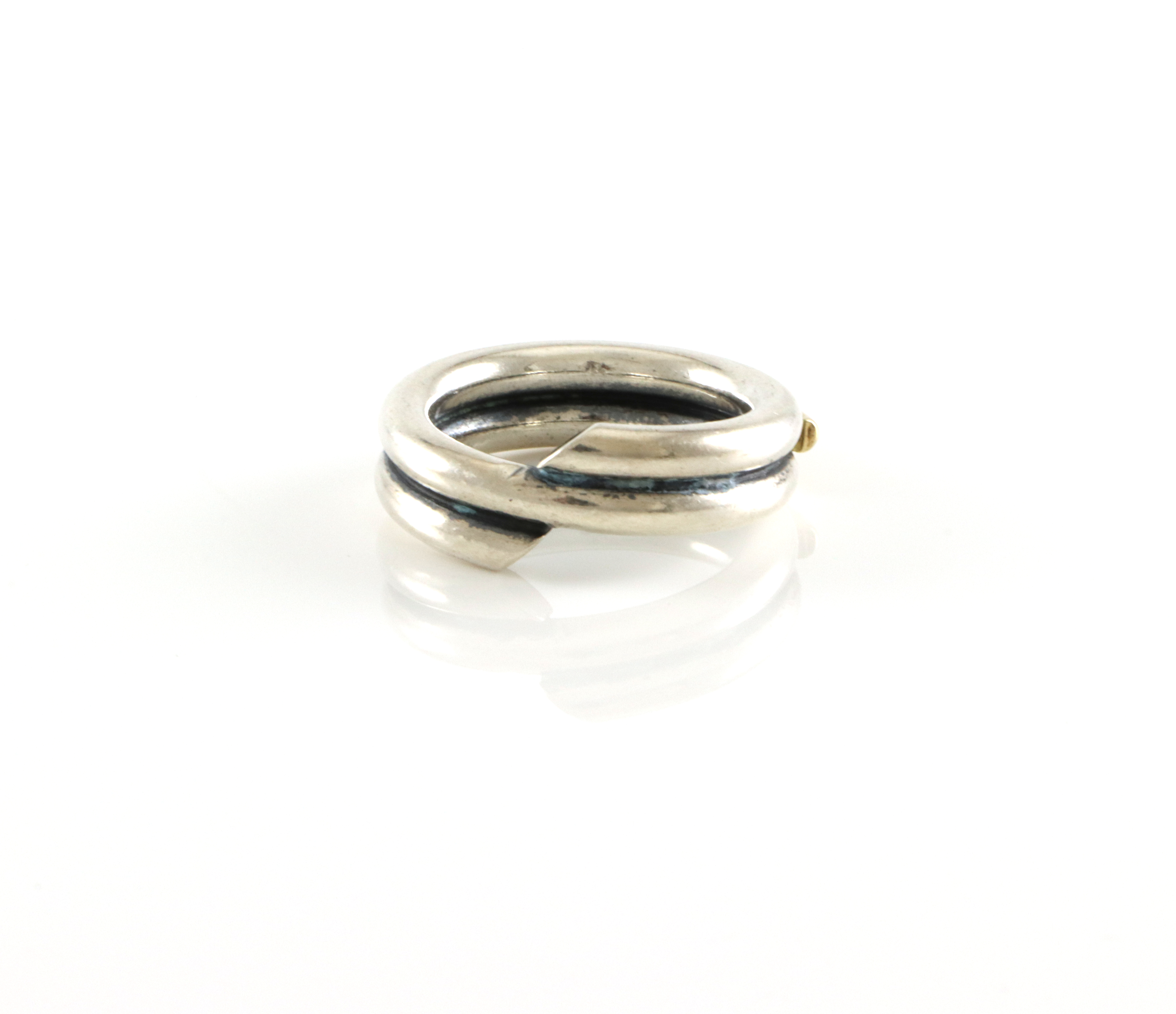 Ring i sølv Den ene delen er forgylt, i den står også en blank stein. Ringstørrelse 52