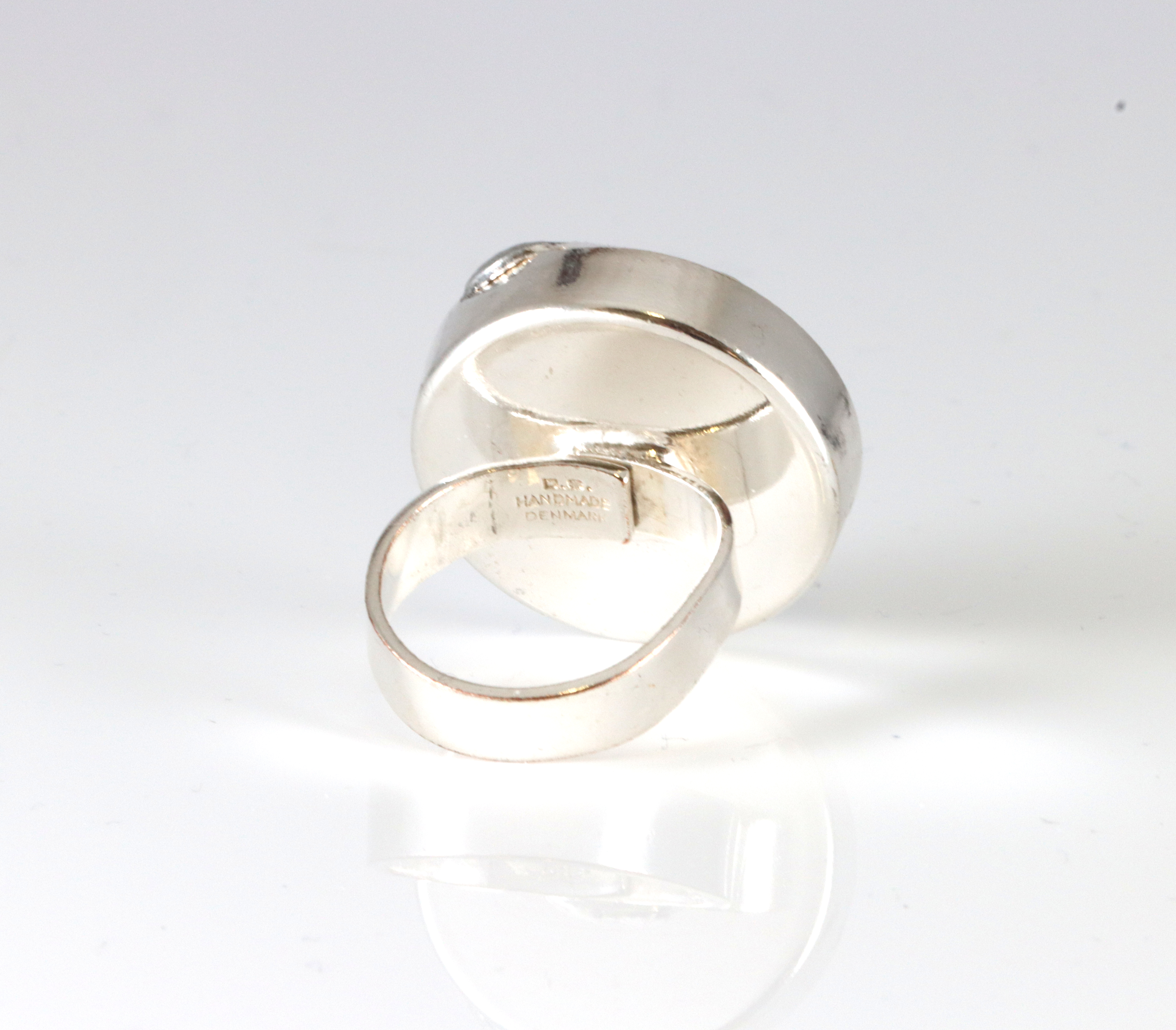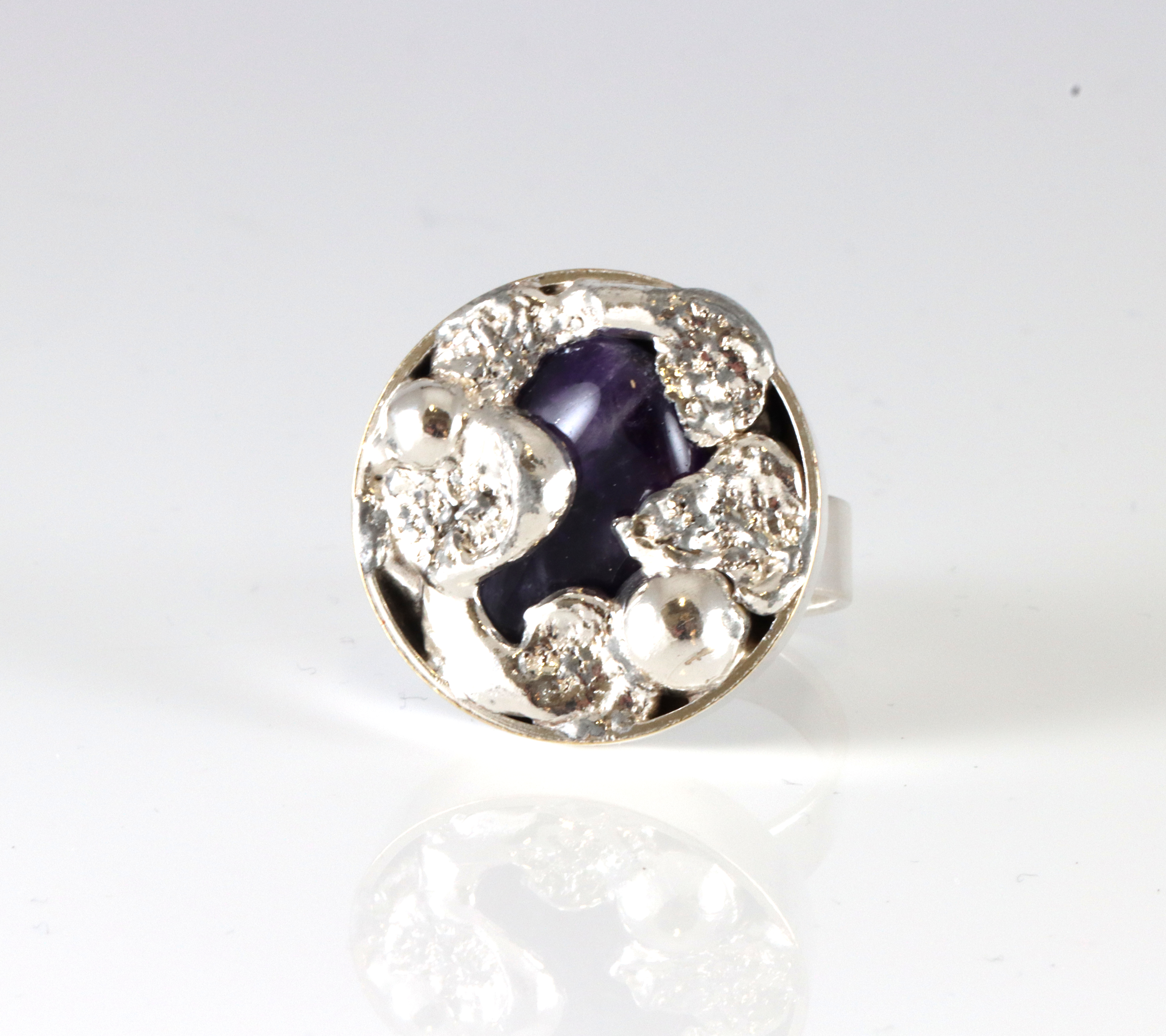 Fantastisk og spesiell sølvring med det som trolig er ametyst. Ringen er dansk, har mestermerke D.S som trolig er Dansk Smykkekunst. Ringen er massiv, utvidbarskinne som er ganske urund etter sist justering. Er i dag ca 54 i ringstørrelse.