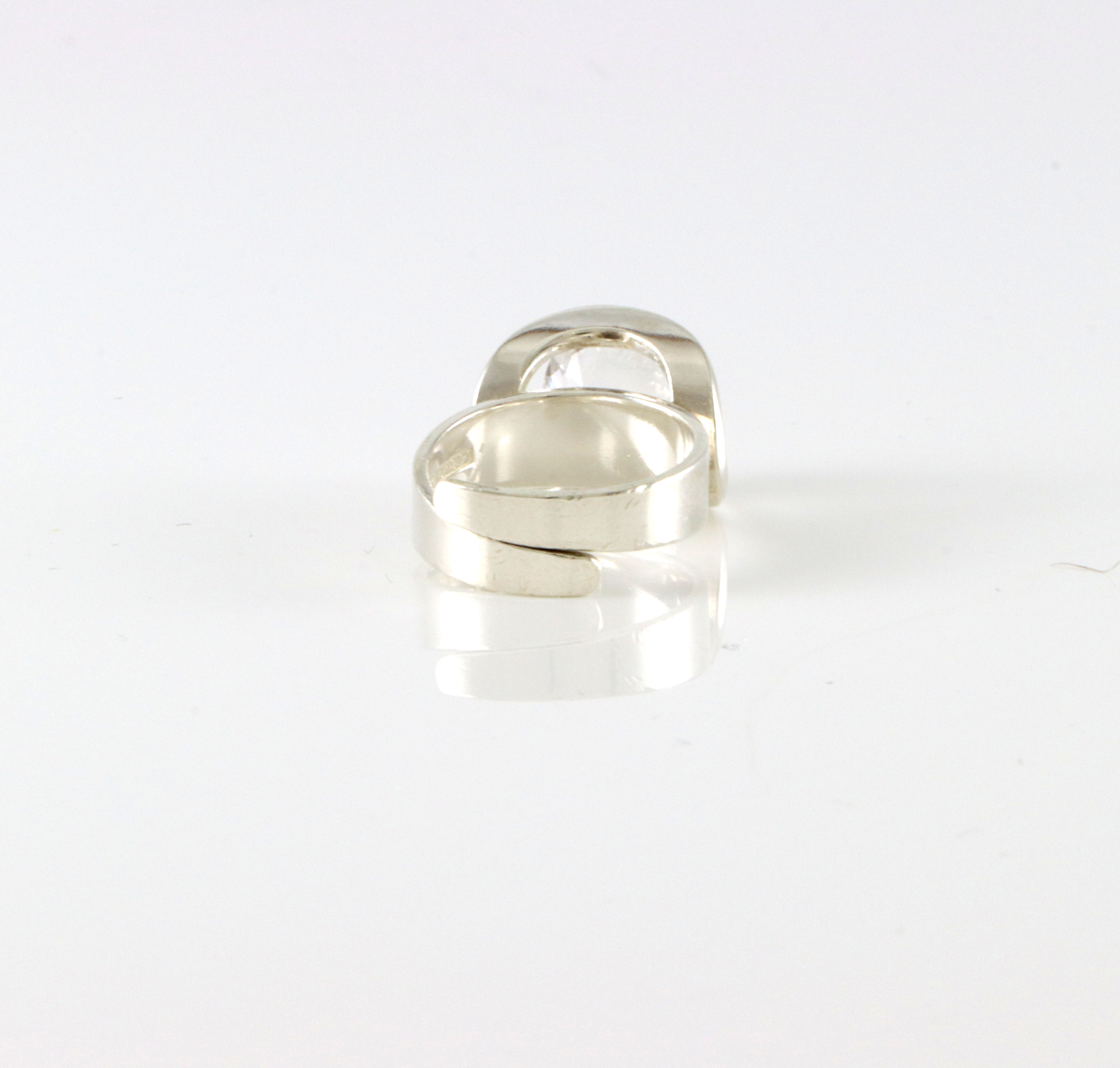 Ring i sølv med rund blank stein (Trolig bergkrystall) Produsert av MEMA. Ringstørrelse: 48 (Åpen skinne, kan utvides mye).