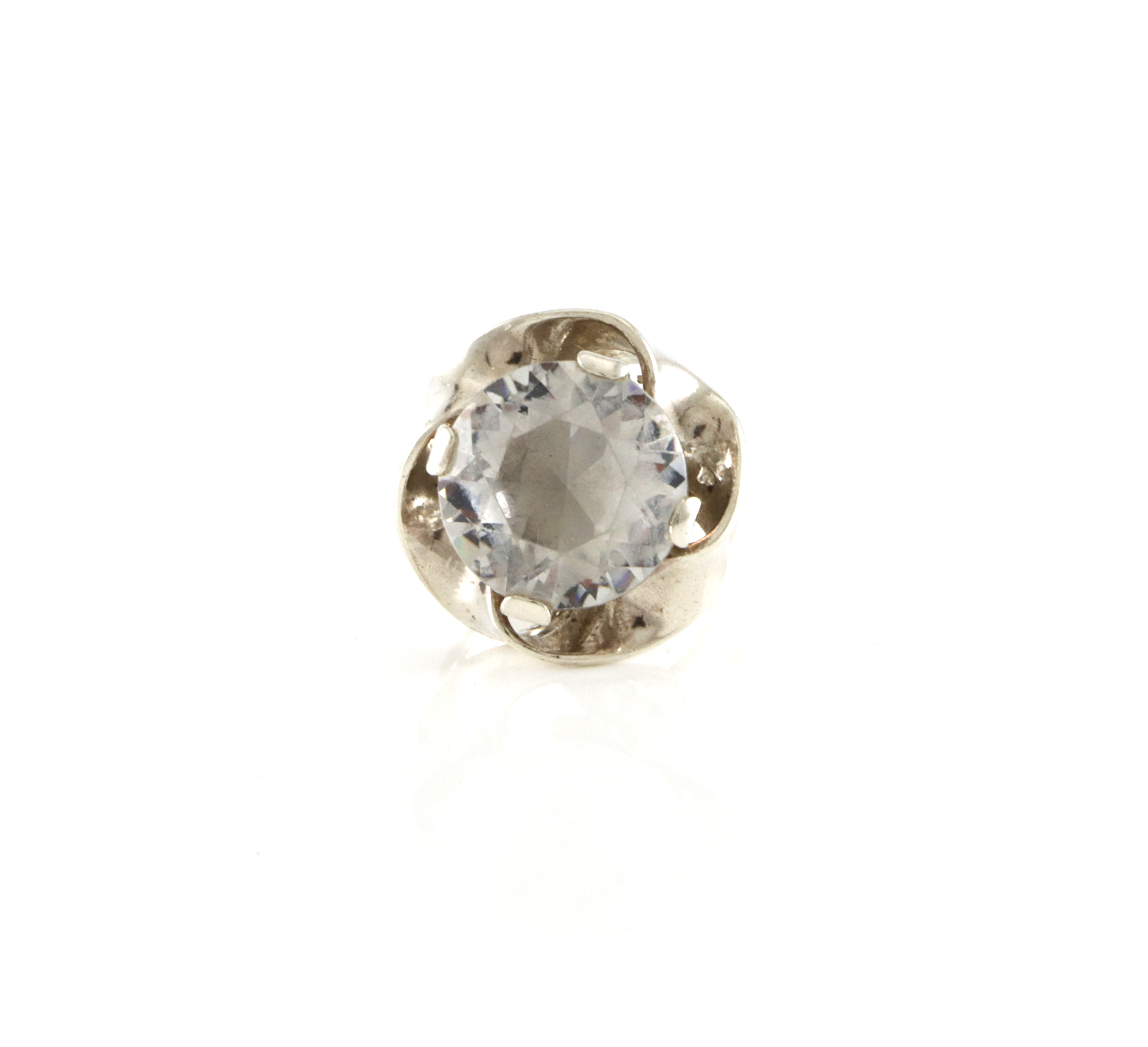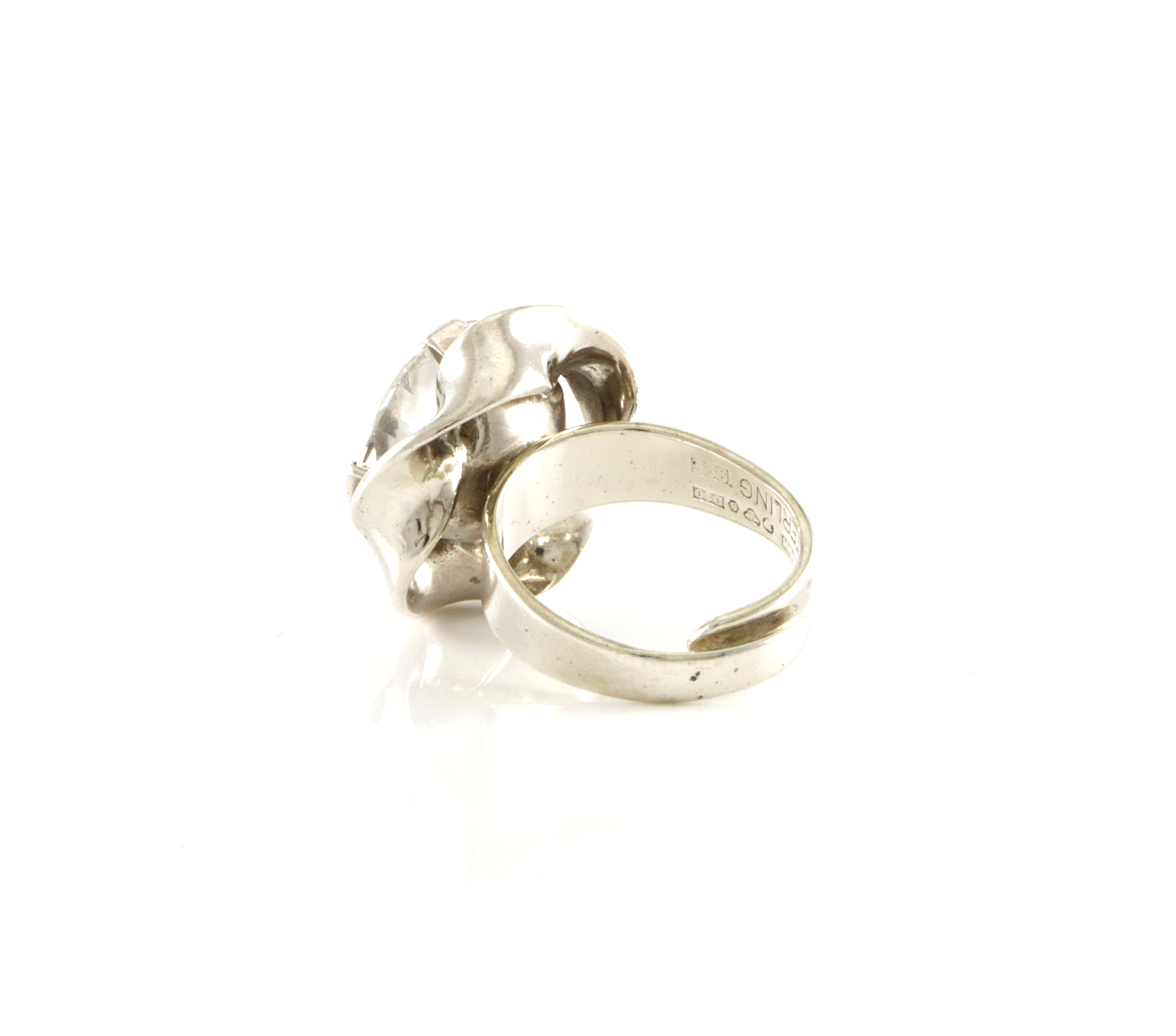 Ring i sølv med blank stein (Trolig bergkrystall) Produsert av svenske ALTON. Ringstørrelse 52 Et snev urund, åpen skinne som kan justeres.