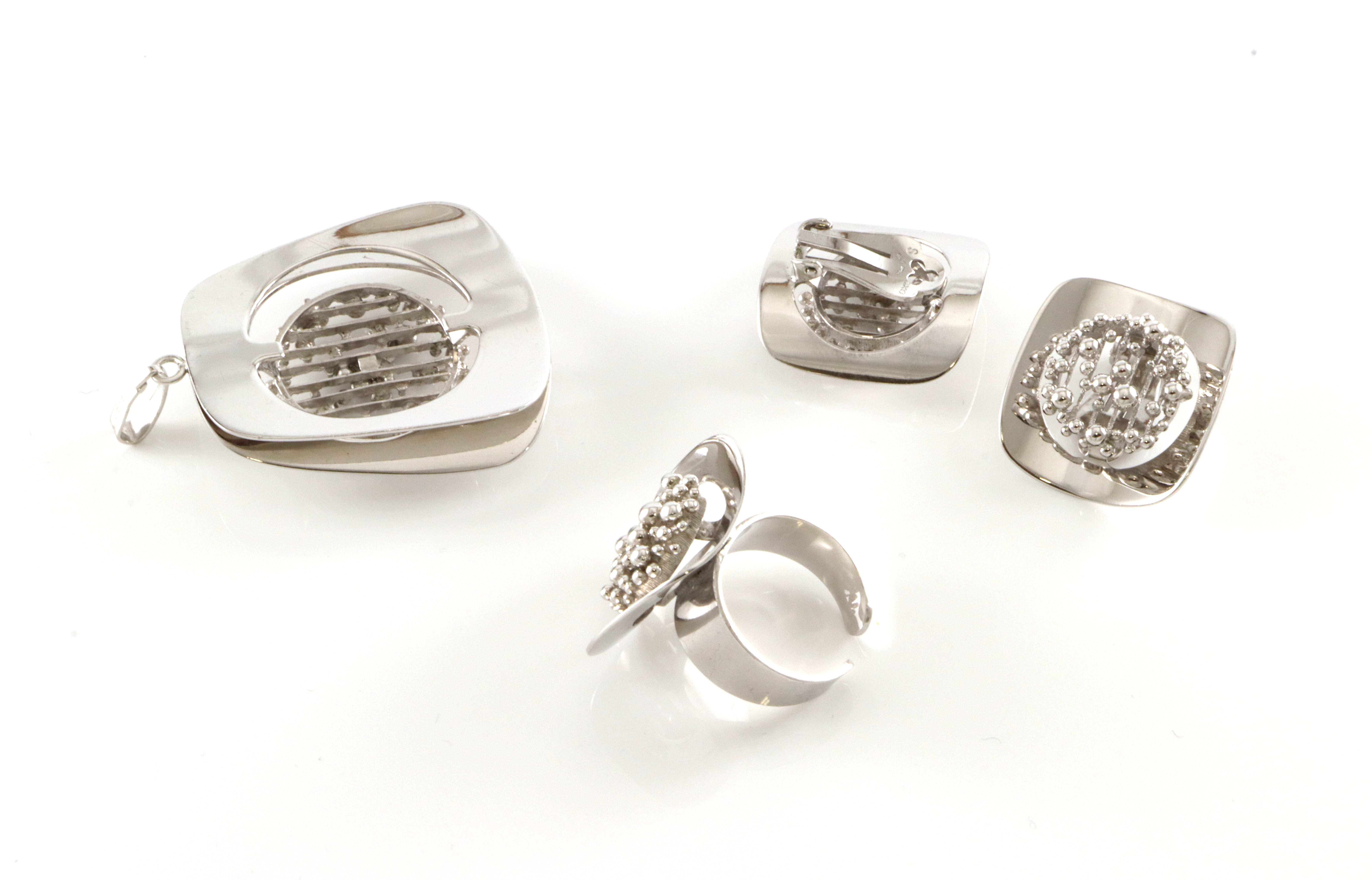 Smykkesett som består av: Anheng (43 x 35 mm) Øreklips (25 x 23 mm) Ring: Str krone: 25 x 21 mm) Ringstr: 56 (Justerbar) Svært lite bruket